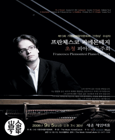 출생:1983 in Locarno, Switzerland프란체스코 피에몬테지는 1983년 스위스 로카르노에서 태어났다. 그는 4세 때 피아노를 배우기 시작했고 2003년 그의 스승 노라 도알로에게서 음악적 수업을 완성했으며 Cesile Ousse에게 중요한 음악적 지도를 받았고, Bernd Glemser, Homero Francesch, Alxis Weissenberg와 마스터클래스에 참가했다.
