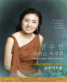 섬세한 음악적 해석으로 따뜻한 감동을 선사하는 피아니스트 신수연은 서울예고와 연세대학교 음악대학을 졸업하고 도독하여 독일 Freiburg 국립음대 Kunstlerische Ausbildung(전문연주자과정)을 졸업하였다. 그 후 스위스로 건너가 Zurich-Winterthur 국립음대 Konzert Diplom을 취득하고 Solist Diplom(최고연주자과정), Neuchatel 국립음대 Prix de Virtuosite(최고연주자과정)을 졸업하였다. 학창시절 한국음악지도자협회 전국학생콩쿨, 삼익콩쿨, 한국피아노학회콩쿨 등에 입상하였고 연세대학교 협주곡의 밤에 출연하여 베토벤의 “황제”를 호연하여 실력을 인정받았다. 스위스 Bolonay 및 St. Moritz Piano MeisterKurs, John Perry, Sebastian Benda, Edith Fischer Piano Kurs에 참여, 연주했으며 유럽의 여러 도시에서 다수의 독주회, 실내악 연주, Joint Recital을 가진 바 있다. 또한 Neuchatel 국립 Orchestra와 협연하는 등 다양한 레파토리와 무대 경험을 쌓아온 그녀는 Italia Ragusa International Grand Competition에서 Distinguished Musician에 입상해 주목을 받았다. 국내에서 정동극장, 금호아트홀 귀국독주회, 예술의전당 리싸이틀홀 독주회를 성황리에 마치고, 4인 음악회, 이원아티스트시리즈 듀오피아노연주, 연대동문연주, 협성대교수음악회, 희연회정기연주회, 사투마레오케스트라 바흐콘체르토, 안성시민회관 피아노독주회, 그랜드피아노연주회 등 다양한 음악활동을 하고 있는 그녀는 국내에서 안희숙교수에게, 국외에서는 James Avery, Hans Schicker, Karl-Andreas Kolly, Marc Pantillon교수에게 사사했다. 후학지도에도 열의를 보이는 신수연은 협성대, 한세대, 중부대 강사를 역임하였으며 아시아 국제 피아노 아카데미 페스티벌 교수로 참여하였다.현재는 수원여자대학교, 선화예중,고, 계원예고에 출강 및 한국피아노학회 연주분과위원으로 활동하고 있다.