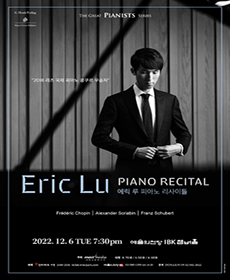 출생:1997.12.051997년 12월 5일 태어난 에릭 루는 촉망 받는 차세대 연주자 중 하나이다. 루는 6살에 도로시 시에게 피아노를 배우기 시작하여, 뉴잉글랜드 음악원 예비 학교에서 알렉산더 코르산티아와 A. 라몬 리베라를 사사했다. 2013년부터 필라델피아의 커티스음악원에서 조나단 비스와 로버트 맥도날드를 사사하고 있으며, 당 타이 손의 제자이기도 하다. 루는 2015년 미국 쇼팽 피아노 콩쿠르, 2014년 모스크바 국제 청소년 쇼팽 콩쿠르, 2013년 미네소타 국제 e 피아노 콩쿠르(슈베르트 특별상도 함께 수상), 2010년 에틀링겐 국제 콩쿠르에서 모두 우승했다. 루는 미국, 독일, 이탈리아, 중국에서 공연했으며, 미네소타 오케스트라, 아르메니아 국립 청소년 오케스트라, 웰즐리 심포니, 롱우드 심포니와 보스턴 시민 심포니와 협연하였다. 쇼팽 콩쿠르 조항에 따라 루는 2015 마이애미에서 열린 미국 쇼팽 피아노 콩쿠르 우승자로 예선 없이 17회 국제 쇼팽 피아노 콩쿠르 본선에 진출하여 4위에 입상하였다.From PLAY Information