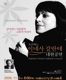 진흙속의 진주처럼 묻혀져 있던 카치니의 아베마리아를 불러 모든 이의 심금을 울린 천상의 소프라노 이네사 갈란테가 2006년에 이어 5번째로 내한 공연을 갖는다. 그녀가 부르는 카치니 아베마리아는 그 누구도 흉내낼 수 없으며, 듣는 이로 하여금 전율을 느끼게 한다. 옛 소련의 라트비아 공화국 출신으로 1992년 독일에서 모차르트 오페라 ‘마술피리’의 파미나 역 으로 서방권에 첫 선을 보인 이래 이제는 일급 가수의 반열에 올라 유럽을 중심으로 활발한 활동을 하고 있다. 그녀의 콘서트는 단순히 소프라노의 기교를 뽐내는 자리가 아닌 한 편의 서정적 에세이와도 같은 음악회이다. 이네사 갈란테는 노래를 부르기에 앞서 곡에 얽힌 사연이나 그녀가 사는 이야기 등을 다정다감한 설명을 덧붙이며 전혀 과장되지 않는 순수한 목소리로 관객들과 교감한다. 더욱이 이번 공연은 오페라 아리아 외에도 갈란테 자신의 고향인 러시아의 노래들이 준비되어 있다. 낮게 내린 저음에 함께 숨을 멈추었다가, 결코 서두르지 않고 다시 떠올라 서서히 하늘까지 솟아오르는 이 시대 최고의 소프라노 이네사 갈란테가 들려주는 고품격 아리아는 깊어가는 가을 밤의 여유를 가져다 줄 것이다.