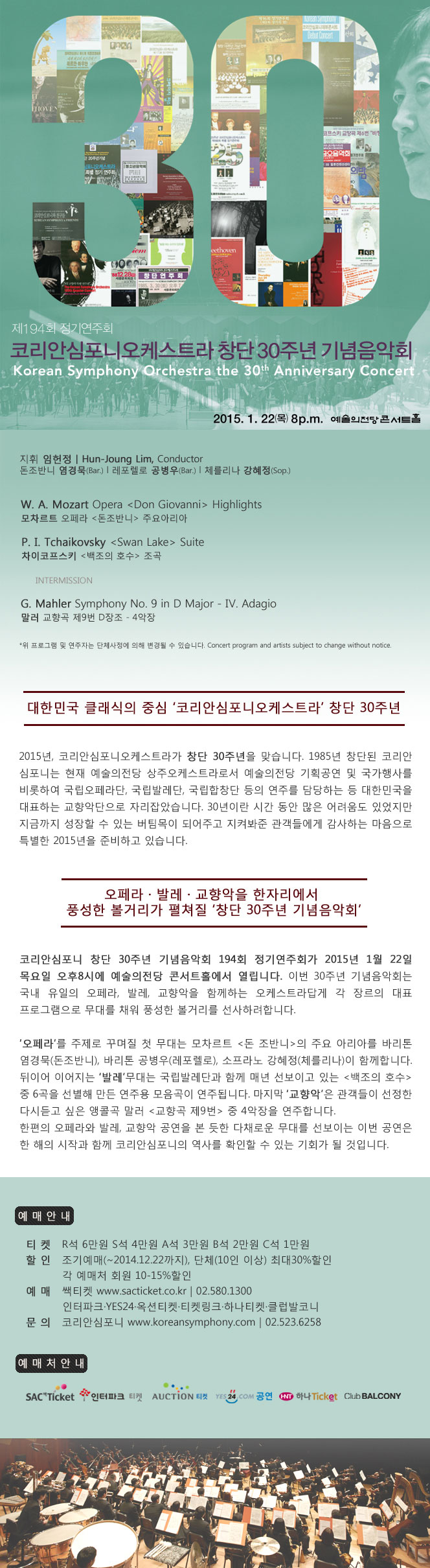 30년이라는 짧지 않은 시간 동안 코리안심포니를 사랑해주신 관객 분들을 위해 준비한 이번 공연을 통해 함께 감동의 순간을 만들어주시기 바랍니다.