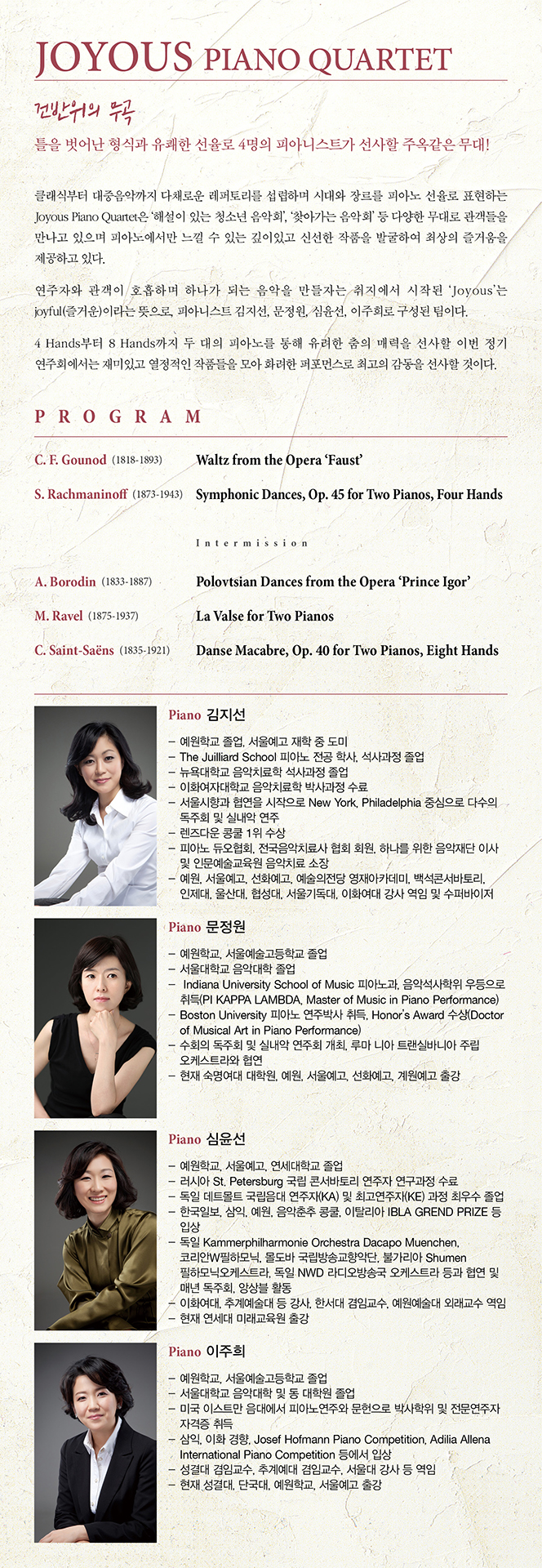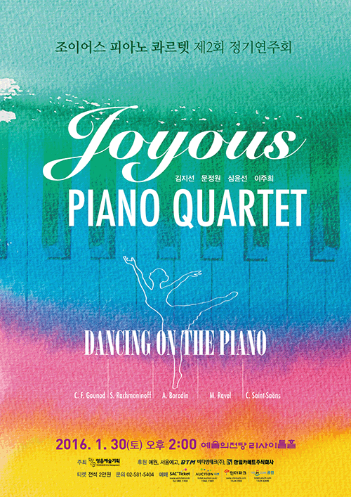 클래식부터 대중음악까지 다채로운 레퍼토리를 섭렵하며 시대와 장르를 피아노 선율로 표현하는Piano Quartet Joyous는 ‘해설이 있는 청소년 음악회’, ‘찾아가는 음악회’ 등 다양한 무대로 관객들을 만나고 있으며 피아노에서만 느낄 수 있는 깊이있고 신선한 작품을 발굴하여 최상의 즐거움을 제공하고 있다.