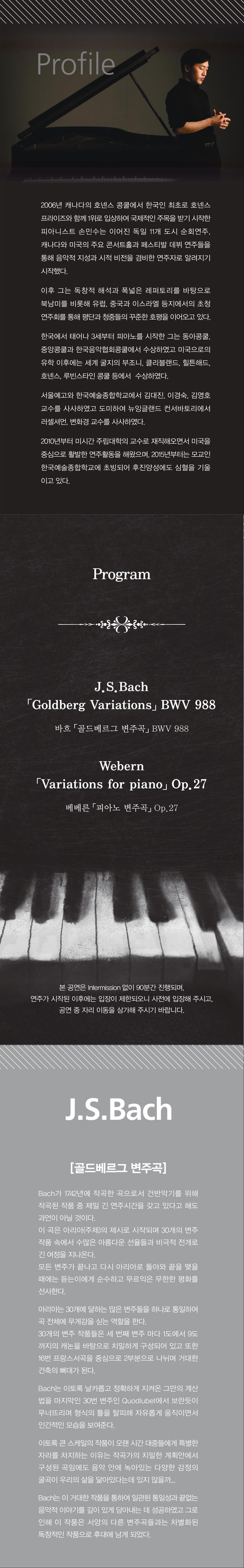 특별히 수많은 세계 언론 및 비평가들로부터 찬사를 받은 그의 메인 레퍼토리인 바하의 [골드베르그 변주곡]과 베베른의 [피아노 변주곡]으로 준비된 이번 무대는 오랜 시간 그를 기다려온 국내 관객에게 잊지 못 할 최고의 무대가 될 것이다.