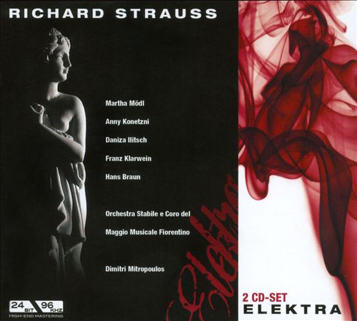 작곡가: Richard Strauss (리하르트 슈트라우스)작곡년도: 1906 - 1908초연: Jan 25, 1909평균연주: 100:07악장1Wo bleibt Ekektra? Ist doch ihre Stunde5:292Allein! Weh, ganz allein9:003Elektra!3:204Ich kann nicht sitzen und ins Dunkel starren6:055Es geht ein Lärm los2:326Was willst du? Steht doch, dort!7:557Die Gotter! bist doch selber eine Göttlin2:368Ich will nichts hören!6:099Ich hab keine guten Nächte8:3410Wenn das rechte Blutopfer4:3411Was bluten muss?3:1512Was sagen sie ihr denn?2:0213Orest! Orest ist tot!5:2914Platz da! Wer lungert so vor einer Tür?1:1215Nun muss es hier von uns geschehn2:3116Du! Du! denn du bist stark!10:4117Nun denn, allein!3:2718Was willst du, fremder Mensch?11:2019Elektra! Elektra5:3920Orest!9:5821Du wirst es tun? Allein?1:4222Seid ihr von Sinnen1:3623Ich habe ihm das Beil nicht geben können!1:5824Es muss etwas geschehen sein1:0125He! Lichter Licther! Ist niemand da5:0526Elektra, Schwester!2:4527Ob ich mich höre?3:1928Hörst du denn nicht, sie tragen ihn2:5829Schweig, und tanze2:35