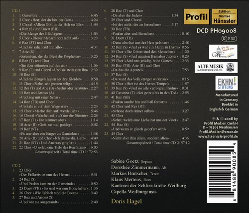작곡가: Felix Mendelssohn (펠릭스 멘델스존)작곡년도: Apr 18, 1836출판년도: 1836 - 1837초연: May 22, 1836평균연주: 120:48악장1Overture7:132Herr, der du bist der Gott der Himmel3:593Allein Gott in der Höh' sei Ehr1:304Die Menge der Glaübigen war ein Herz1:565Dieser Mensch hört nicht auf zu reden Lasterworte3:136Und sie sahen auf ihn alle4:507Jerusalem, Jerusalem3:308Sie aber stürmten auf ihn ein1:489Und sie steinigten ihn2:4510Die Herr, dir will ich mich ergeben1:2911Und die Zeugen legten ab ihre0:5212Siehe, wir preisen sellig, die erduldet haben3:5113Saulus aber zerstorte... Vertilge sie, Herr Zebaoth2:2114Und zog mit... Doch der Herr (Aria & Arioso)3:0315Und als er auf dem Wege war (Recitative with chorus)2:3716Mache dich auf, werde Licht4:5517Wachet auf, ruft uns die Stimme (Chorale)2:1018Die Männer aber, die1:1619Gott sei mir gnadig5:3420Es war aber ein Jünger zu Damascus1:4621Ich danke dir, Herr (Aria with chorus)4:4822Und Ananias ging hin und kam in das1:4623O welch eine Tiefe des Reichtums5:1624Der Erdkreis ist nun des Herrn4:3625Und Paulus kam zu der Gemeinde0:5726So sind wir nun Botschafter1:3727Wie lieblich sind die Boten3:1228Und wie sie ausgesandt... Lasst uns singen von der (Recitative & Arioso)2:3329Da aber die Juden das sahen1:2230Ist das nicht5:3631Paulus aber und Barnabas sprachen1:0232Denn also hat uns der Herr2:2933Und es war ein Mann zu Lystra1:0834Die Götter sind den Menschen gleich geworden1:1535Und nannten Barnabas Jupiter0:3236Seid uns gnädig, hohe Gotter2:3837Da das die Apostel sahen7:0438Da ward das Volk erregt0:2939Hier ist des Herrn Tempel1:5540Und sie alle verfolgten0:3741Sei getreu bis in den Tod (Cavatine)3:4342Paulus sandte hin1:4543Schone doch deiner selbst3:2944Sehet, welch eine Liebe hat uns der Vater erzeiget2:4645Und wenn er gleich geopfert wird1:0146Nicht aber ehm allein, sondern allen4:07